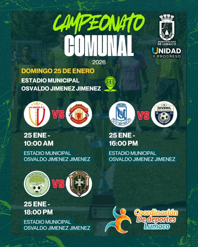 Este domingo 25 de enero, el Estadio Municipal Osvaldo Jiménez Jiménez será el escenario del Campeonato Comunal de Fútbol 2026, una importante instancia deportiva organizada por la Coordinación de Deportes de Lumaco, que reunirá a clubes representativos de distintos sectores de la comuna.
